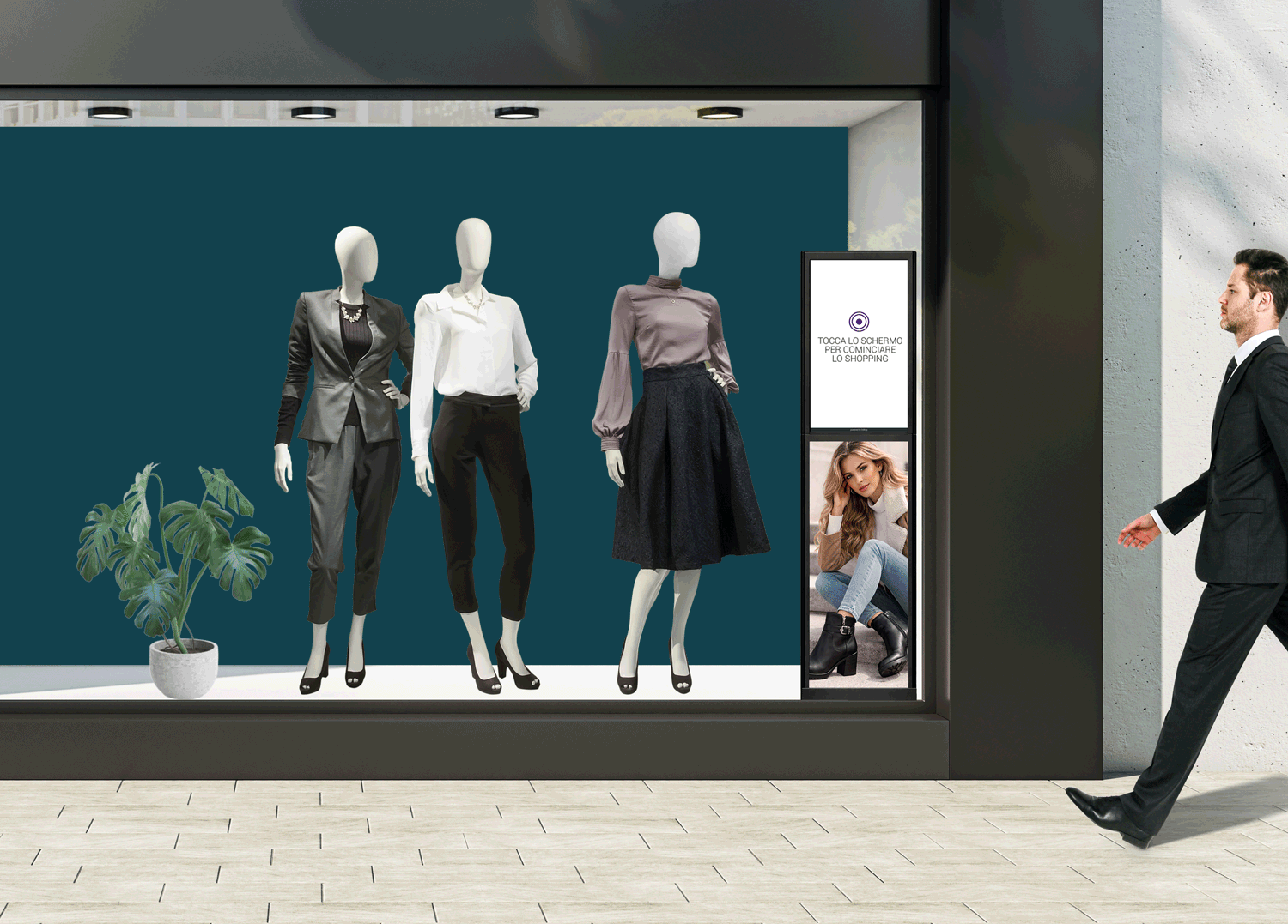 Toccando il vetro dall’esterno i passanti possono navigare il catalogo del tuo negozio e acquistare prodotti, pagando digitalmente.